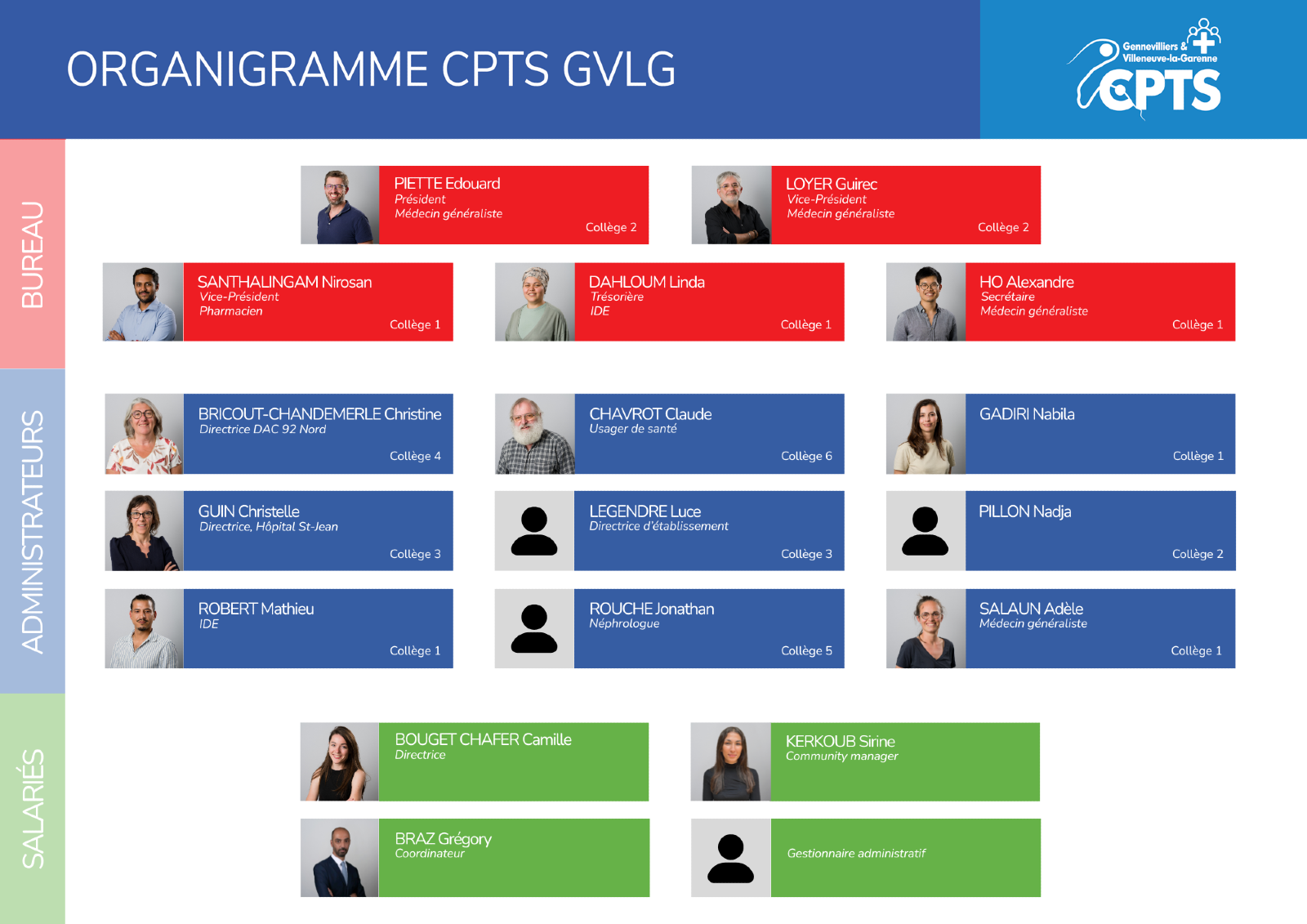 Découvrez les membres de l’équipe du bureau, les administrateurs et l'équipe salariée de la CPTS GVLG.